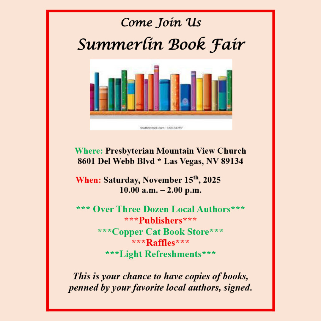 Mark your calendars for the Summerlin Book Fair happening on November 15, 2025—a celebration of stories, imagination, and community you won’t want to miss! Whether you’re hunting for your next favorite read, connecting with fellow book enthusiasts, or simply soaking in the lively atmosphere, the Summerlin Book Fair promises an inspiring day filled with pages, people, and possibilities. Come join us and experience the magic of books in the heart of Summerlin!